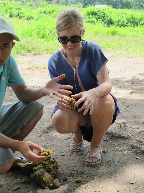 We also learned how they check the health of each elephant each morning. Healthy elephants will have dirt on one of their sides from laying down to sleep. If an elephant is sick, they do not lay down, because they know they may not be able to get back up. Healthy elephants will have sweat marks around their toe nails, which is where they sweat from. Otherwise, they are not sweating properly. Healthy and happy elephants have their ears back and relaxed and a swinging tail. We learned that they can tell quite a lot from elephant dung as well, and they inspect it every morning - the amount and smell of it tells how well their digestive system is working, the texture of the fibers tells how strong and healthy their teeth are, and the moisture content tells how well hydrated they are. I know, I'm like an elephant expert now! One of our first interactions with the elephants other than feeding them was to clean them off and bathe them in the river - quite a fun task!