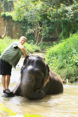 After our swim, we got back on our elephants - this time, we tried the head-mounting option, and I actually found this a lot easier (and much more fun!) than the knee-lift option. We proceeded on an incredibly steep trek up into the jungle. I had no idea that elephants could climb up and down so well, especially through such thick and deep mud (they had just been having a ton of rain and flooding in Chiang Mai prior to our visit). We made one more stop, and then we doubled up for our final ride of the day. Matt and I both rode bareback on his elephant Macom, because she was the larger of our two. We spent most of that ride treking throuh a river, which was pretty cool. As always, Macom started near the end, but passed everyone during the journey, and ended up leading the pack! After dismounting the elephants, we got to feed our original elephants another bucket of bananas and say goodbye. Our van was there to take us back to our hotel, but not before the owner had some advice for us and lessons that we can learn from elephants. He hoped that next time we saw an elephant, we would remember our time with them this day and think of them in a different way.
